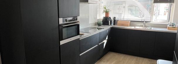 Een heel andere uitstraling kreeg deze keuken in L-vorm. Wij wrapten ‘m van strak wit naar houtlook zwart met voelbare nerf. Deze kleur heet Black Picta en de folie is niet van echt hout te onderscheiden. Naast het wrappen vervingen wij de gaskookplaat voor een inductiekookplaat.