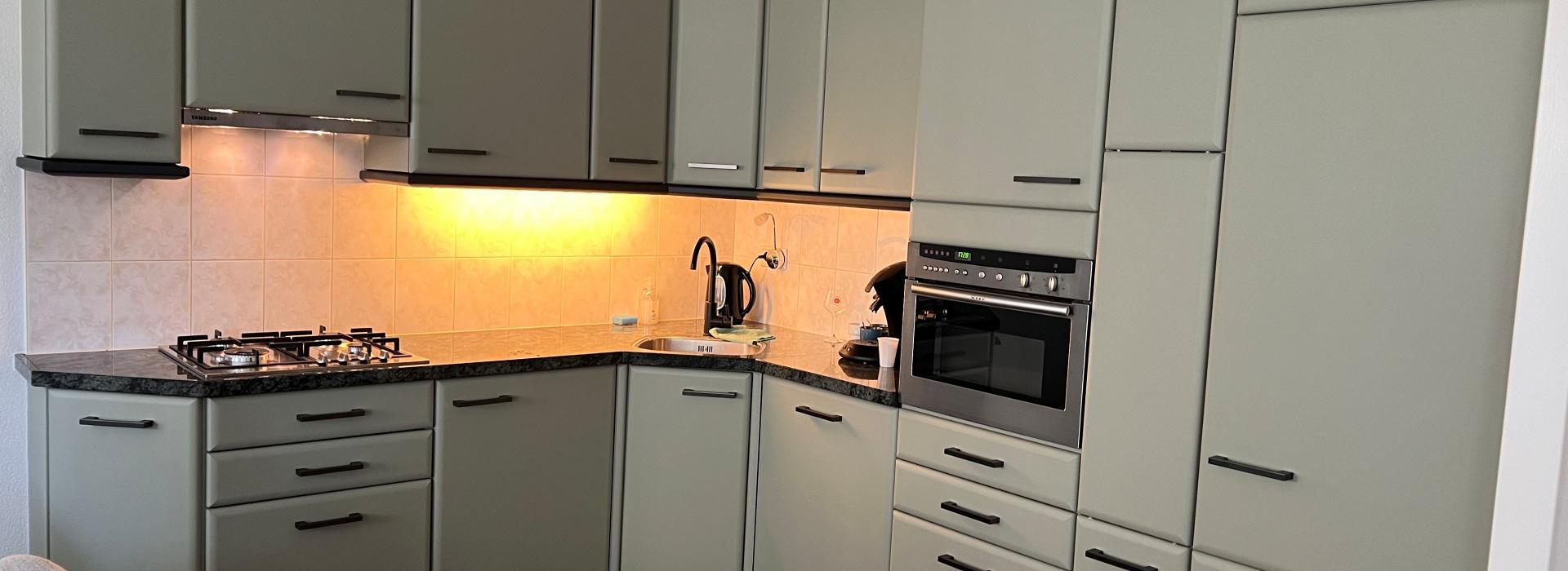 Interieurfolie in Basswood groen en nieuwe grepen, dat kregen alle deurtjes van deze grote L-vormige keuken. Daarnaast installeerden we er een nieuwe gaskookplaat en een onderbouwafzuigkap.