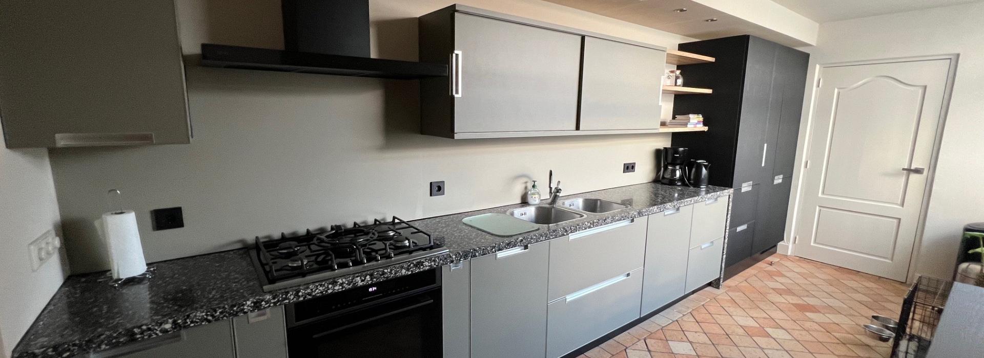 Maar liefst 3 nieuwe, moderne kleuren kreeg deze bestaande keuken voor een andere uitstraling. Van een zwarte houtlook voor de hoge kasten en een mud-kleur voor de kastjes tot een turtle-tint waarmee we de achterwand hebben gewrapt. Ook plaatsten we voor deze klant een nieuwe afzuigkap en vervingen we de oven.
