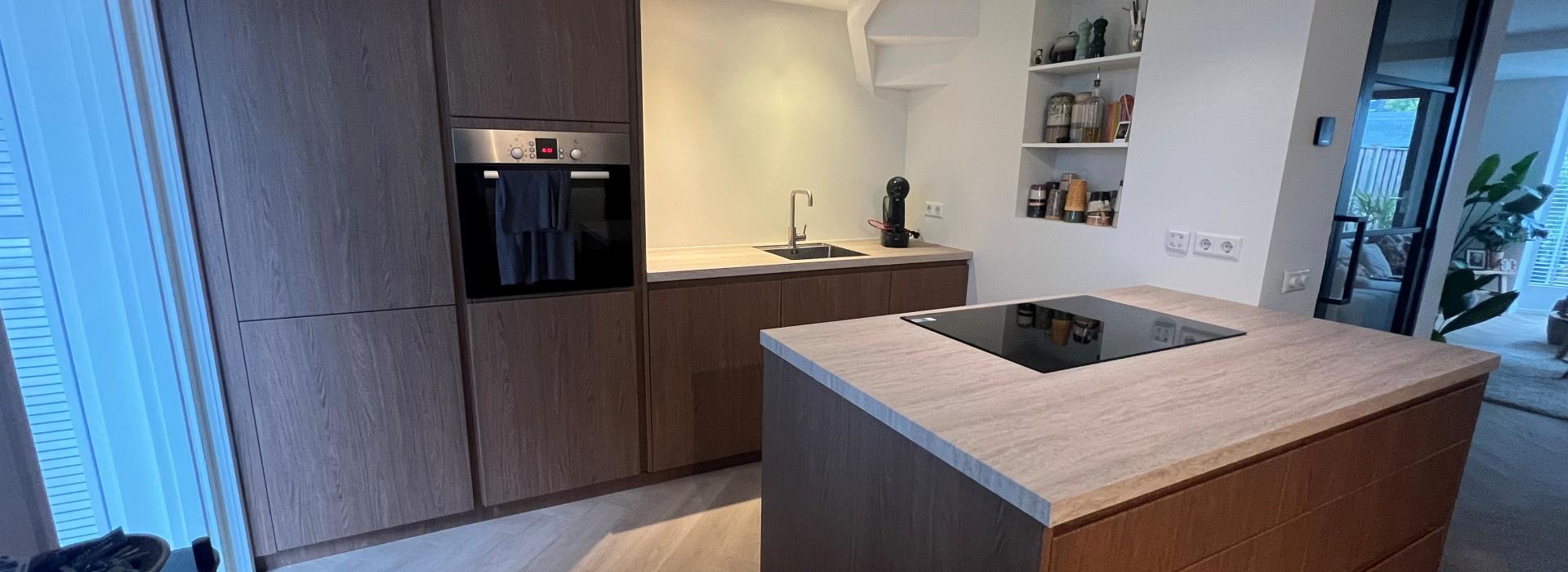 Met uitsluitend wrappen kreeg ook deze keuken een compleet nieuwe look. De keuken, inclusief kookeiland, voorzagen wij van een donkere houtlookfolie waarop de houtnerf voelbaar is. Het bestaande werkblad rond de spoelbak kreeg een folie in travertin natuursteenlook.